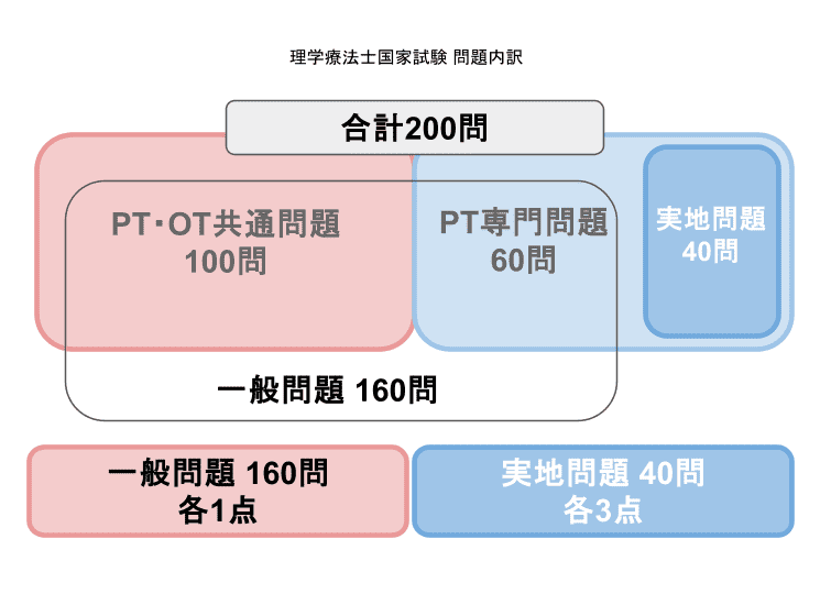理学療法士国家試験は午前と午後に分けて実施され、出題数は午前に100問、午後に100問の計200問、試験時間は合計320分です。