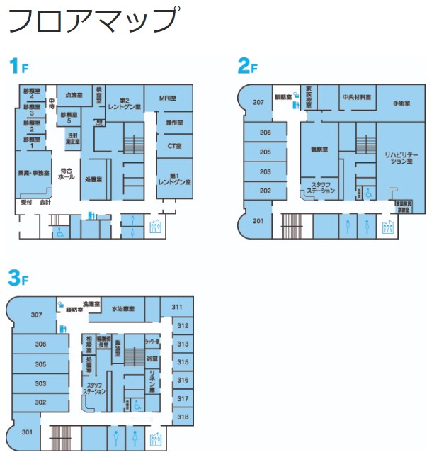 - リハビリテーション科、胃腸科、外科、内科、呼吸器科、整形外科、脳神経外科、その他